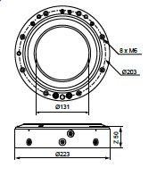 Chuck for permanent mounting on the machine table or into a PM press. Fixed index positions 4×90° Hardened references Clamping force 20 000 N Permissible torque 600 Nm Required drawbar 3R-695.2-185 Required air pressure, – 6±1 bar Weight 9 kg
